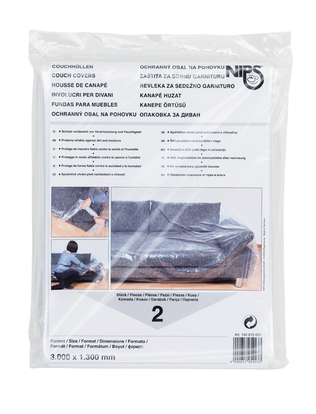 2 couch covers, compact folded in foil bags with sales promotion folder incl. EAN barcode