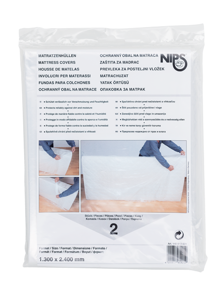 2 mattress covers, compact folded in foil bags with sales promotion folder incl. EAN barcode